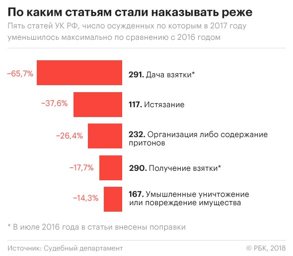 Наиболее заметно снизилось число осужденных за насильственные преступления — против жизни и здоровья, а также за преступления против интересов службы в государственных, коммерческих и иных организациях (это дача и получение взятки, превышение полномочий и злоупотребление ими, коммерческий подкуп). Сократилось также число осужденных за экологические преступления и преступления против собственности (к последним относятся кража, мошенничество, присвоение или растрата, грабеж, вымогательство).