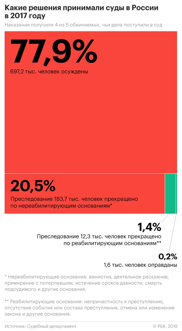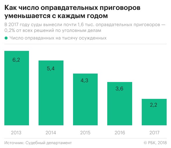 В 2016 году суды признали невиновными на тысячу подсудимых больше, чем год спустя. В 2013 году оправданных было втрое больше, чем в 2017 году, — 4,5 тыс. Общее количество рассмотренных судами уголовных дел в последние годы постепенно снижается (как и количество осужденных), но доля оправданий падает интенсивнее. В 2016 году на один оправдательный приговор приходилось 280 обвинительных, годом позже — 446.