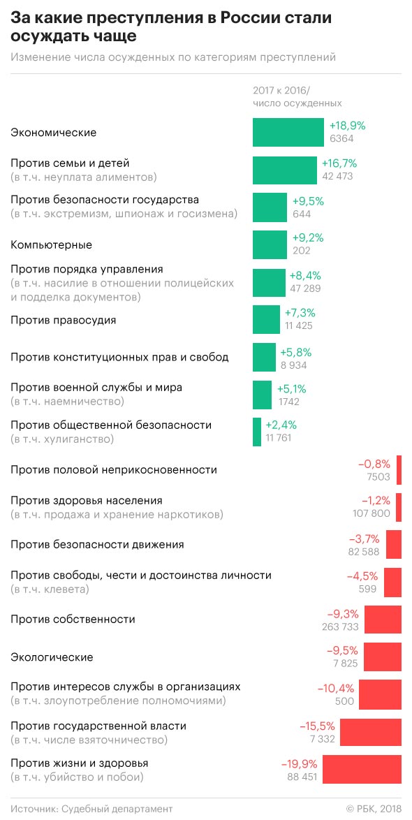 Также возросло число приговоров за преступления против семьи и несовершеннолетних (это, например, неуплата алиментов или вовлечение ребенка в преступления), против основ конституционного строя и безопасности государства (возбуждение ненависти либо вражды, госизмена, шпионаж), а также в сфере компьютерной информации.