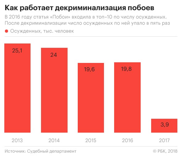 При этом падение количества осужденных за насильственные преступления связано в том числе с декриминализацией побоев в семье. С февраля 2017 года действуют изменения в УК, согласно которым побои, нанесенные близкому родственнику и «причинившие физическую боль, но не повлекшие последствий», в первый раз наказываются в административном порядке, а не в уголовном.