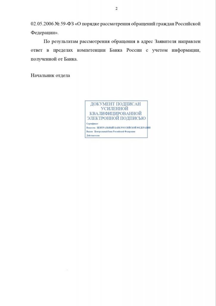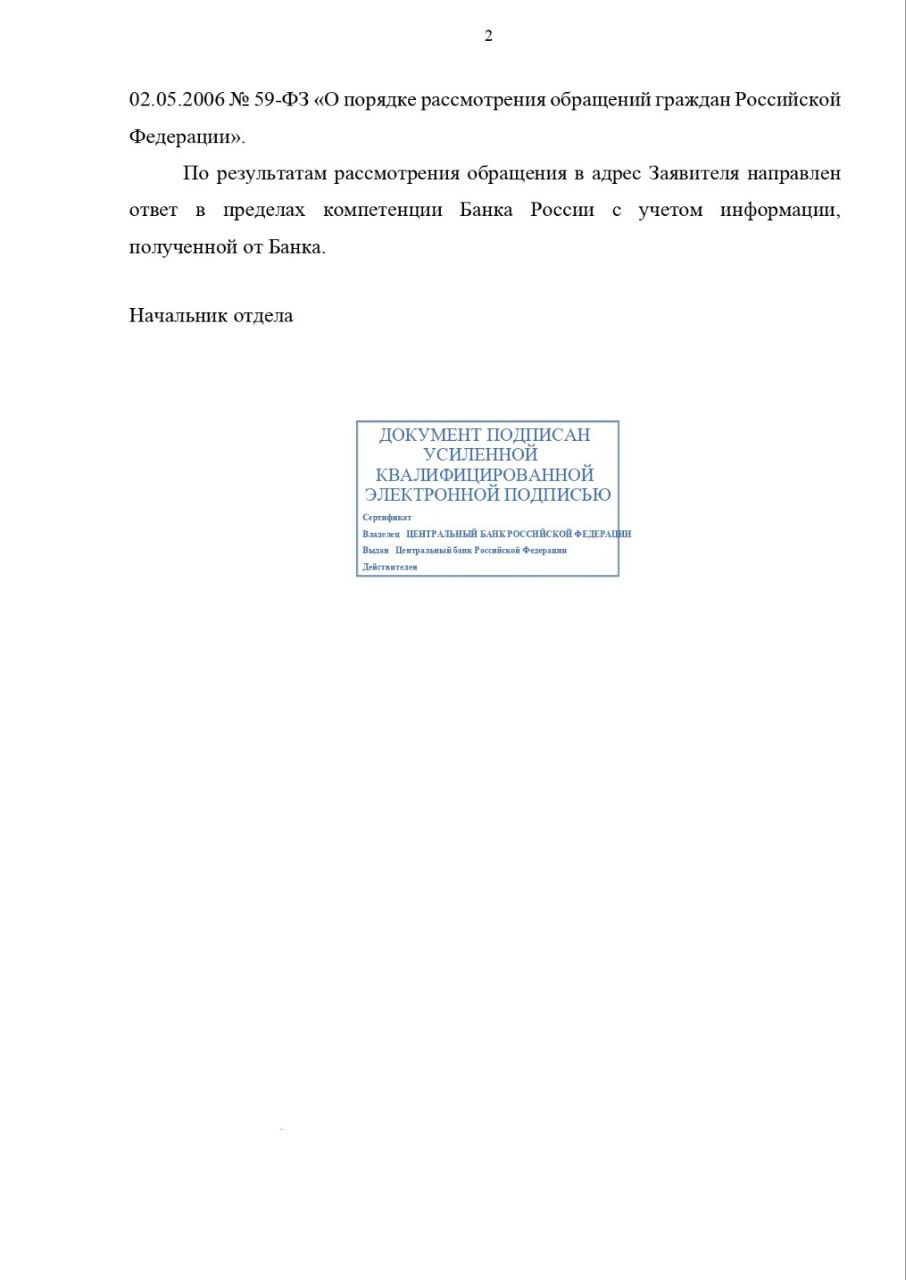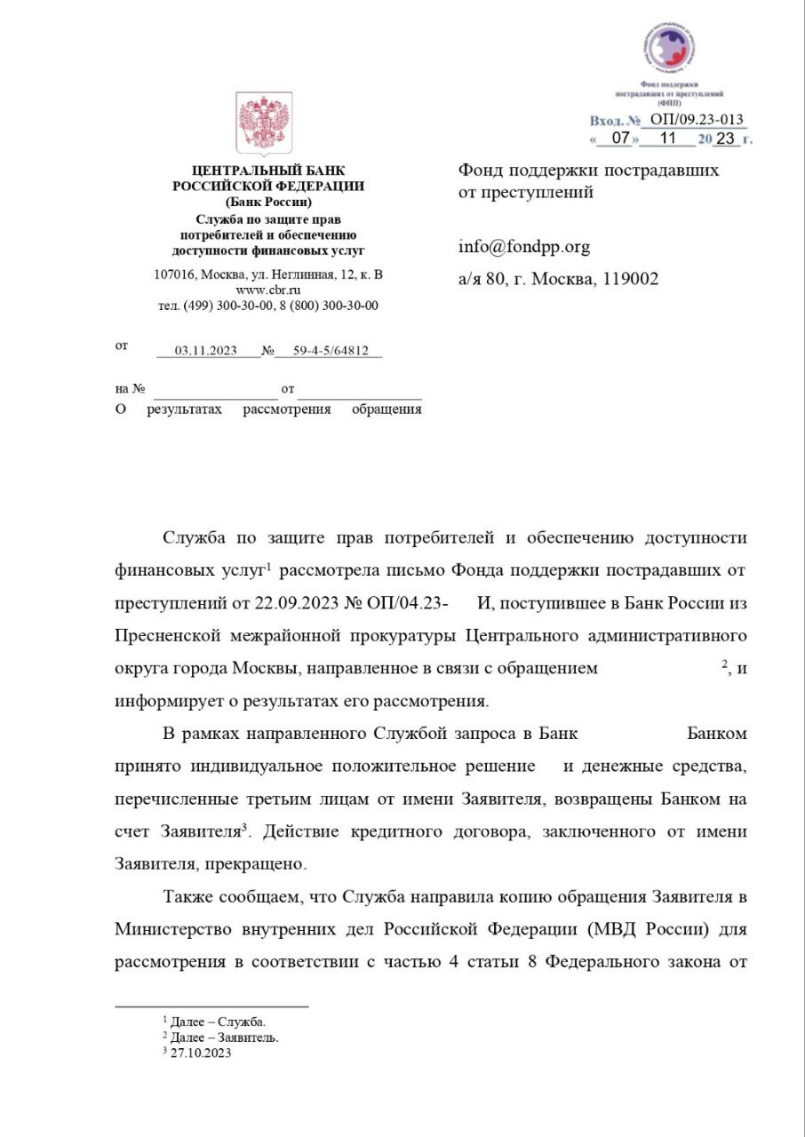 «Служба по защите прав потребителей и обеспечению доступности финансовых услуг рассмотрела письмо Фонда поддержки пострадавших от преступлений от 22.09.2023 № ОП/04.23-106И, поступившее в Банк России из Пресненской межрайонной прокуратуры Центрального административного округа города Москвы, направленное в связи с обращением Галины Д., иинформирует о результатах его рассмотрения.