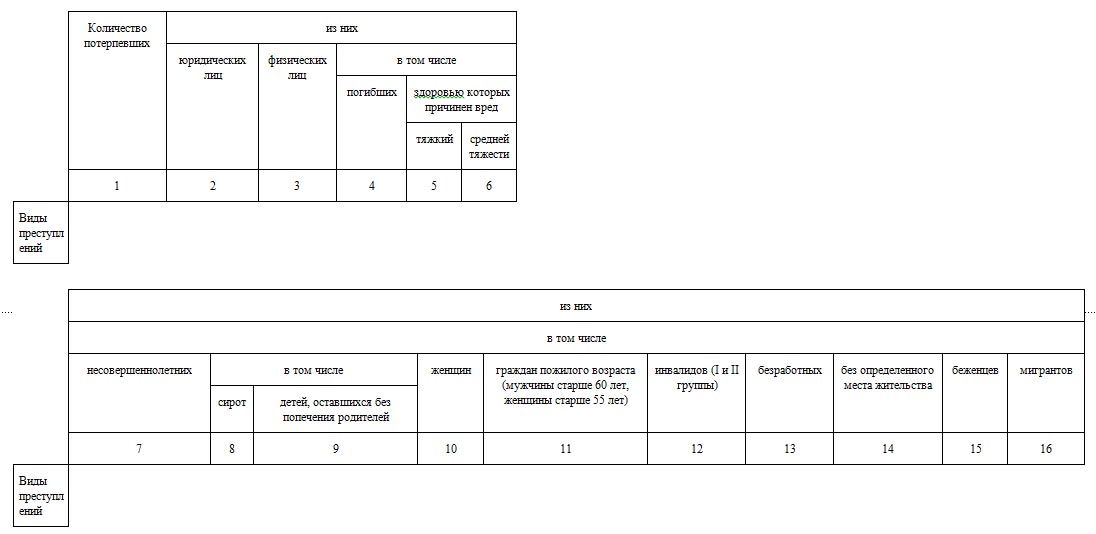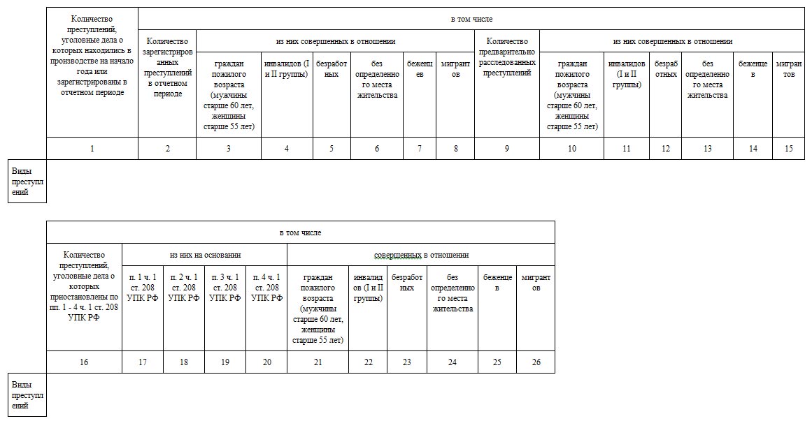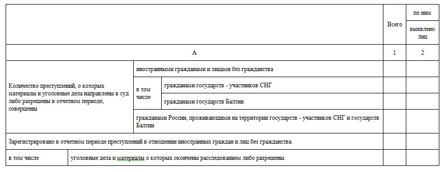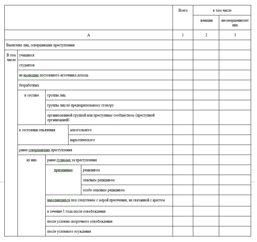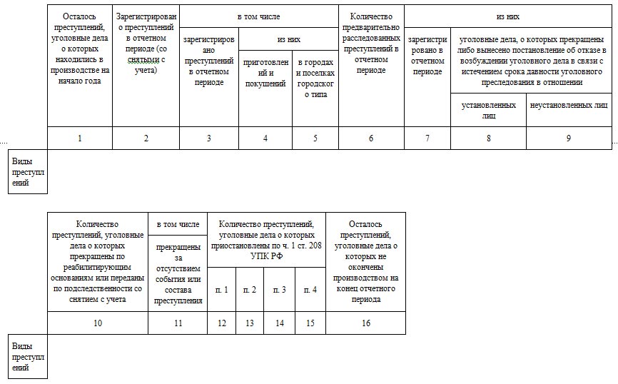 Состоит данная форма из 21 раздела, которые соответствуют главам особенной части уголовного кодекса РФ, кроме первого и последнего разделов. В первом разделе заполняются суммированные показатели, отдельно по каждому правоохранительному органу, а в последнем заполняют количественные показатели преступлений, квалифицируемых по статьям УК РСФСР и статьям УК РФ, утративших силу в связи с принятием нового закона, усиливающего ответственность или иным образом ухудшающего положение лица. Соответственно данная форма состоит из 370 строк и 10 граф предназначенных для заполнения. В общей сложности данная форма содержит в себе 3700 пунктов статистических показателей.