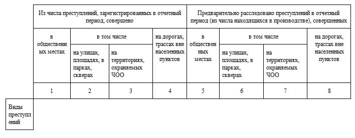 Раздел 7. Сведения о зарегистрированных и предварительно расследованных преступлениях в отчетном периоде, совершенных в общественных местах и на улицах, а также на дорогах, трассах вне населенных пунктов (8 граф и 15 строк)