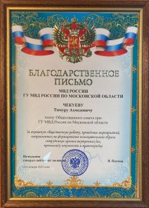 Заместитель начальника ГУ МВД РФ по Московской области Андрей Зеленов вручил юристу Фонда Тимуру Чекуеву благодарственное письмо подмосковной полиции «за активную общественную работу, проведение мероприятий, направленных на формирование положительного образа сотрудников органов внутренних дел, пропаганду законности и правопорядка».