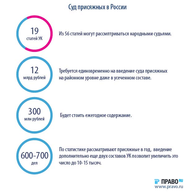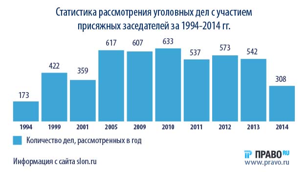В России вопросом о том, насколько ответственно присяжные подходят к процессу, озабочены, казалось бы, меньше, чем на Западе. Больше волнует юридическую общественность вопрос, будет ли в стране вообще эффективный институт присяжных. Отвечая на вопрос журналистов о его перспективах, председатель ВС Вячеслав Лебедев отметил: «Я согласен с тем, чтобы присяжные были по более широкой категории дел. Если правозащитники считают, что надо ввести суды присяжных по всем абсолютно категориям дел – ради Бога, почему же я должен возражать?» Однако, несмотря на видимое отсутствие возражений у представителей властей, суд присяжных в России используется не слишком часто: по итогам 2014 года судами присяжных рассмотрено 308 дел, в 14 % случаев вынесены оправдательные приговоры. Суды присяжных действуют лишь в судах областного уровня, а судьи «из народа» по большей части рассматривают только те дела, по которым обвиняемым грозит пожизненное заключение.