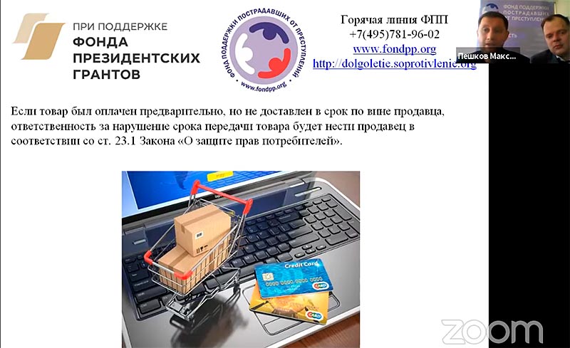 10 марта 2021 года Фонд поддержки пострадавших от преступлений провел вебинар «Защита прав потребителей. Особенности дистанционной покупки товаров и услуг» в рамках проекта «Право на безопасное долголетие» для ветеранских организаций и ЦСО ВАО. Проект реализуется с ноября 2020 года на средства гранта Президента Российской Федерации на развитие гражданского общества в 2020 году.