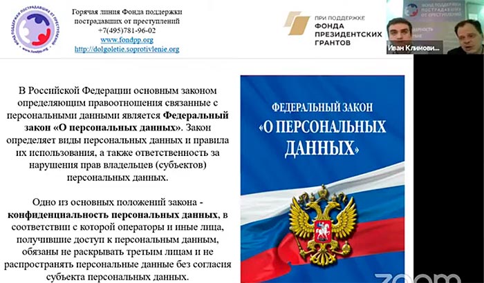 14 апреля 2021 года Фонд поддержки пострадавших от преступлений провел вебинар «Защита персональных данных граждан» в рамках проекта «Право на безопасное долголетие» для ветеранских организаций и ЦСО ВАО. Проект реализуется с ноября 2020 года на средства гранта Президента Российской Федерации на развитие гражданского общества в 2020 году.