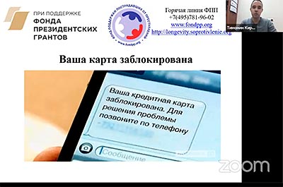 16 ноября 2020 года Фонд поддержки пострадавших от преступлений провел третий вебинар — «Мошенничества в финансовой сфере» — в рамках проекта «Право на безопасное долголетие» для ветеранских организаций и ЦСО ТиНАО. Проект реализуется с ноября 2020 года на средства гранта Президента Российской Федерации на развитие гражданского общества в 2020 году.