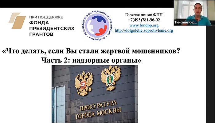 24 июня 2021 года Фонд поддержки пострадавших от преступлений провел вебинар «Что делать, если Вы стали жертвой мошенников? Часть 2. Надзорные органы» в рамках проекта «Право на безопасное долголетие» для ЦСО ВАО. Проект реализуется с ноября 2020 года на средства гранта Президента Российской Федерации на развитие гражданского общества в 2020 году.