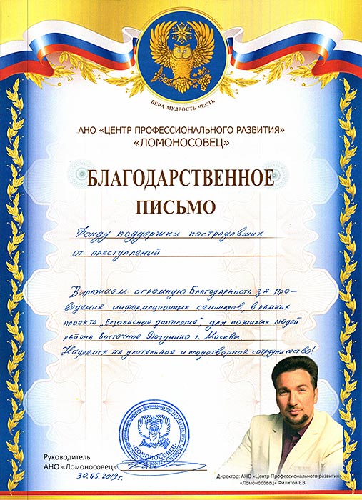 Так же руководство и коллектив АНО «Ломоносовец» выразило благодарность Фонду поддержки пострадавших от преступлений за сотрудничество.