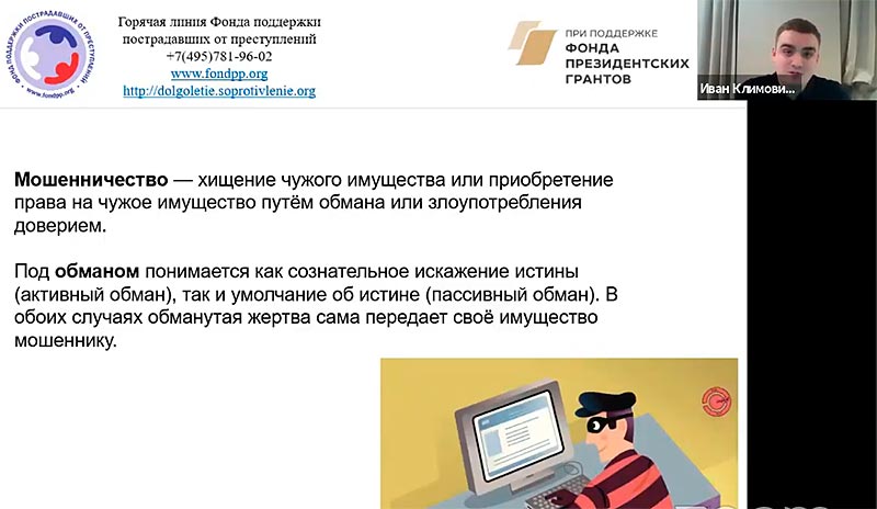Иван Климович подробно рассказал о том, что такое мошенничество с точки зрения права, какие законодательные акты регулируют правовое поле в этой сфере.