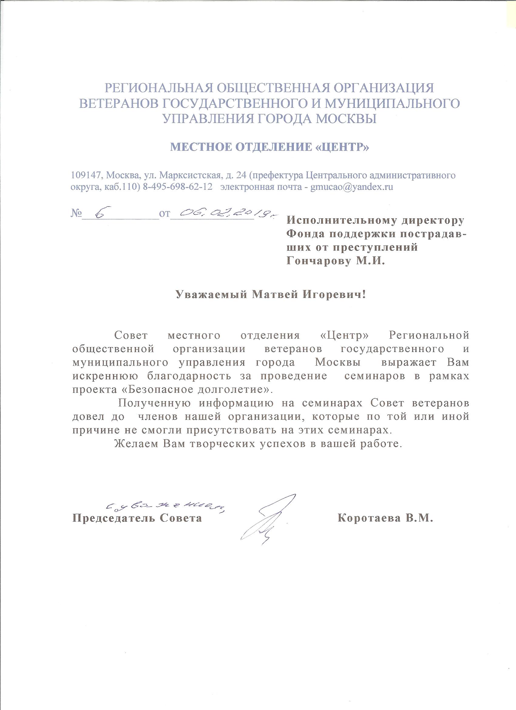 В адрес Фонда и руководства организации поступило благодарственное письмо от Совета ветеранов отделения «Центр». В свою очередь руководство и сотрудники Фонда благодарны организаторам семинаров. ФПП готов к дальнейшему сотрудничеству.