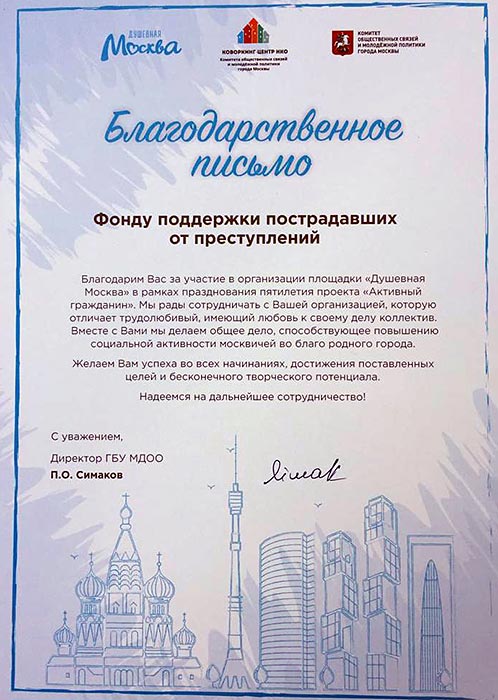 Фонд поддержки пострадавших от преступлений получил благодарственное письмо от Московского дома общественных организаций. В свою очередь, руководство и коллектив Фонда признательны Московскому дому общественных организаций и Комитету общественных связей и молодёжной политики города Москвы за плодотворное сотрудничество.