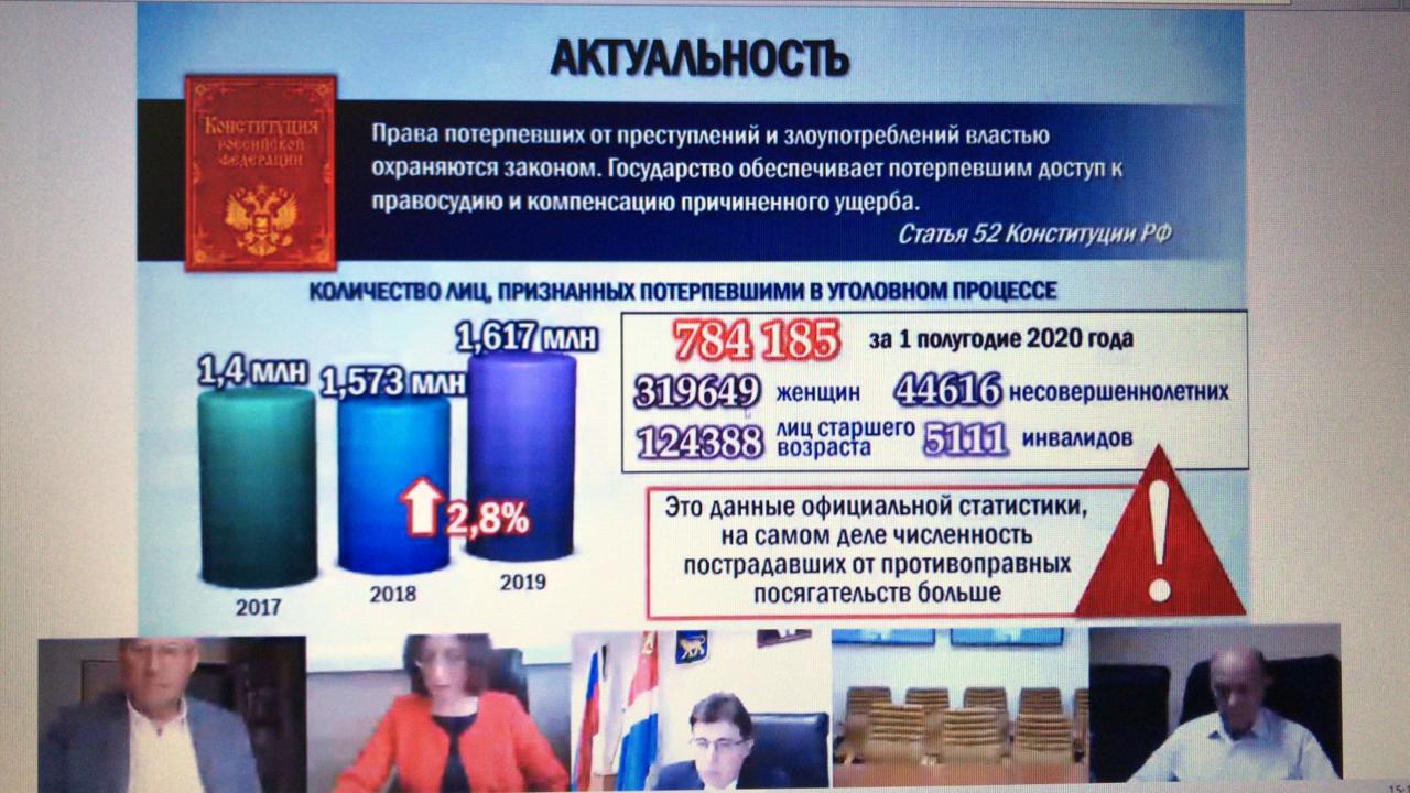 В своем выступлении Уполномоченный по правам человека в РФ Татьяна Москалькова отметила основные проблемы защиты прав потерпевших. В 2019 году потерпевшими в уголовном процессе признаны 1,6 млн человек, что на 2,8% больше, чем в 2018 году. За 6 месяцев 2020 года в Аппарат Уполномоченного от пострадавших от преступлений поступило 1445 обращений — на 1,5% больше, чем за 6 месяцев 2019 года.