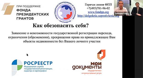 2 ноября 2020 года Фонд поддержки пострадавших от преступлений провел первый вебинар в рамках проекта «Право на безопасное долголетие» — «Мошенничества в сфере недвижимости» для ветеранских организаций и ЦСО ТиНАО. Он прошел на базе коворкинг-центра ТиНАО Московского дома общественных организаций. Трансляция вебинара велась на платформе ZOOM и на Ютуб-канале.
