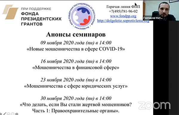 «Значительный рост мошеннических преступлений фиксируется уже несколько лет», — заявил, открывая вебинар, исполнительный директор ФПП Матвей Гончаров. – «В январе-сентябре 2020 года в форме мошенничества официально зарегистрировано более 32 тысяч преступлений, что составляет почти 30 % от общего числа зарегистрированных преступлений в Москве. Наш проект нацелен на противодействие мошенническим преступлениям. Главная задача проекта – максимально снизить количество жертв таких преступлений, помочь сориентироваться в правовом пространстве».