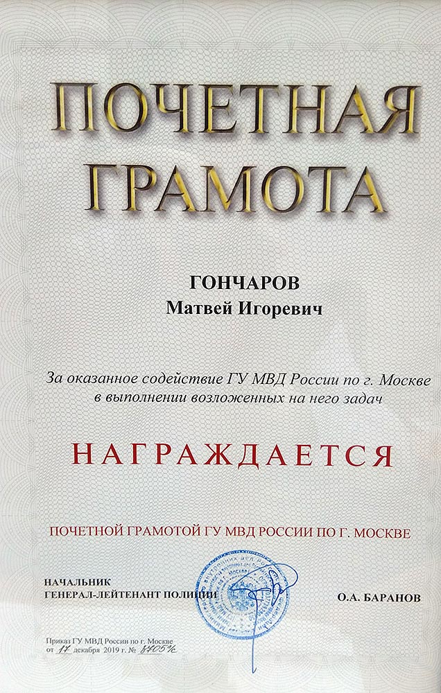 Как и ряд членов совета, Матвей Гончаров был награжден грамотой «За содействие ГУ МВД России по г. Москве в выполнении возложенных на него задач». Почетные грамоты вручил начальник столичного главка Олег Баранов.