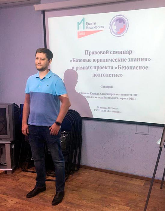28 января 2019 года в ТЦСО «Таганский» прошел третий семинар для пожилых граждан, организованный Фондом поддержки пострадавших от преступлений (ФПП) в рамках проекта «Безопасное долголетие». Семинар был посвящен базовым юридическим знаниям, которые позволят пенсионерам более уверенно себя чувствовать при заключении различных договоров и сделок купли-продажи. Семинар провели юристы ФПП Александр Кошкин и Кирилл Тимонин.