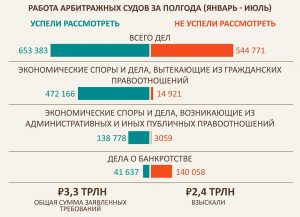 По результатам рассмотрения, арбитражные суды взыскали за полгода 20,4 млрд руб. из затребованных 34,4 млрд по делам о ценных бумагах. В делах, связанных с охраной интеллектуальной собственности, эта сумма составила 3 млрд руб., при том что заявлено было 14,8 млрд. В корпоративных спора суды взыскали 9,2 млрд руб. из 36,2 млрд затребованных. По налоговым спорам, истцы заявляли 6,5 млрд руб. Взыскать же удалось 1,4 млрд. Самая же успешная для истцов ситуация оказалась в делах, связанных с применением антимонопольного законодательства. Из заявленных 1,5 млн руб. удалось взыскать 1,2 млн.