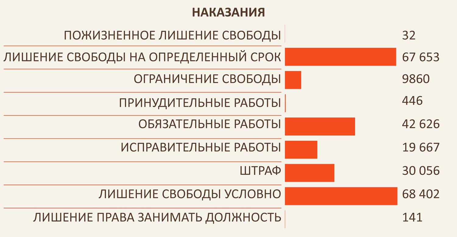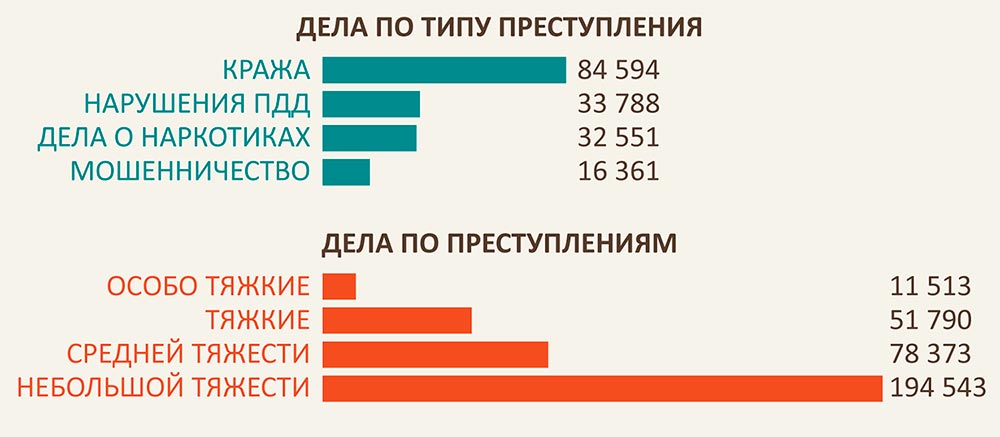 Как отмечает Суддеп, среди осуждённых в этом полугодии, 86 344 — рецидивисты. 68 520 человек совершили преступления в состоянии алкогольного опьянения. Группой совершили злодеяния 27 364 преступника.