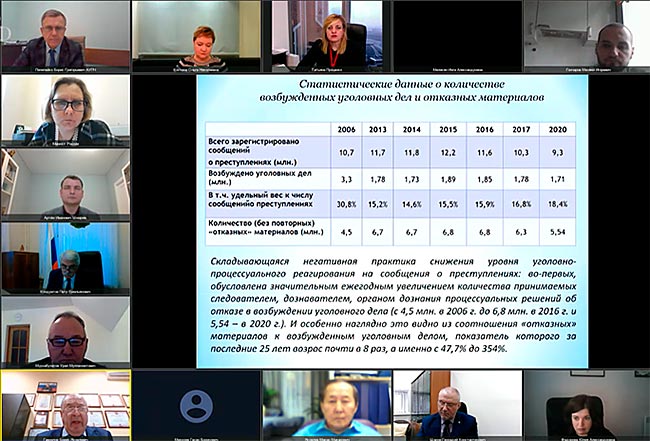Большой интерес вызвало выступление заслуженного юриста РФ, доктора юридических наук, профессора Бориса Гаврилова, который провел глубокий анализ данных о, так называемых, отказных материалах. По мнению известного эксперта, эта проблема определяет низкую эффективность уголовного судопроизводства – в суд направляется только около 30% уголовных дел. При этом, решение об отказе нарушает права порядка 5 млн. пострадавших от преступлений. Борис Гаврилов привел данные, которые показывают, что ежегодно число возбужденных уголовных дел неуклонно и существенно сокращается, при этом число зарегистрированных сообщений о преступлениях примерно одинаково.