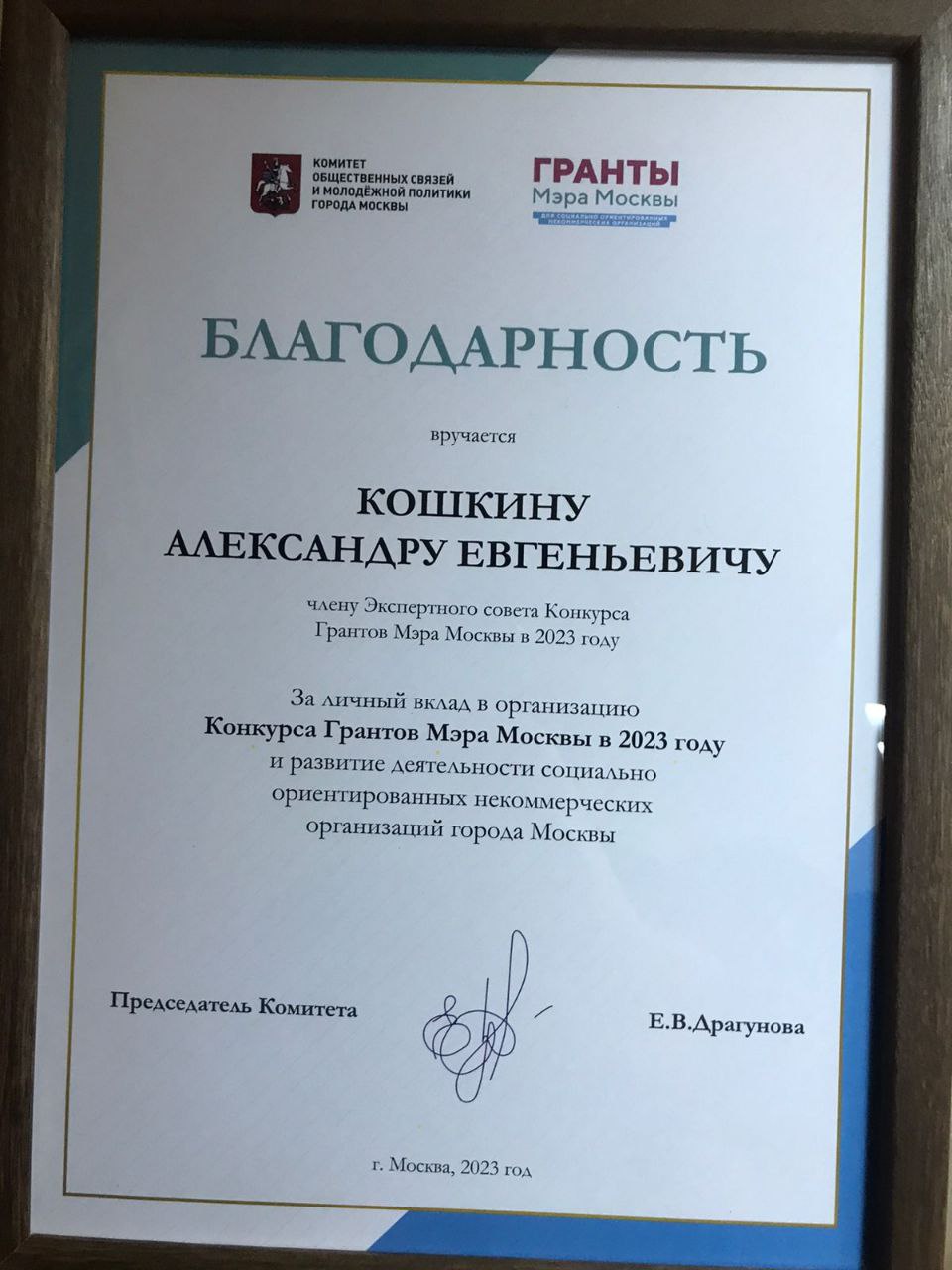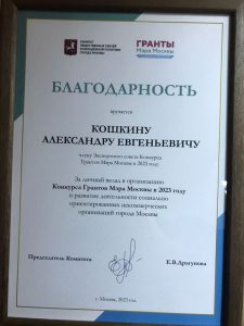 Старшему юристу Фонда поддержки пострадавших от преступлений Александру Кошкину выражена благодарность Комитета общественных связей и молодёжной политики города Москвы.