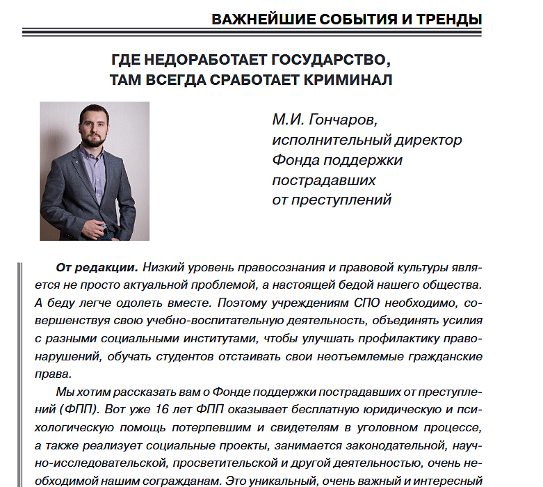 В октябрьском номере приложения к ежемесячному теоретическому и научно-методическому журналу «Среднее профессиональное образование» опубликована статья исполнительного директора Фонда поддержки пострадавших от преступлений Матвея Гончарова. В объёмном авторском материале юрист и общественный деятель определил главные правовые темы, в освещении которых сегодня крайне заинтересовано молодое поколение профессионалов. Это и правовая статистика, и защита от мошеннических преступлений, и … Read more