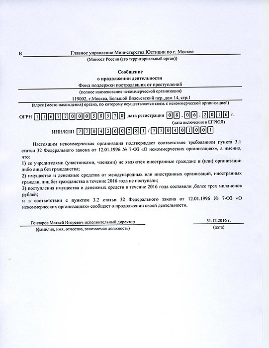 Информация о продолжении деятельности